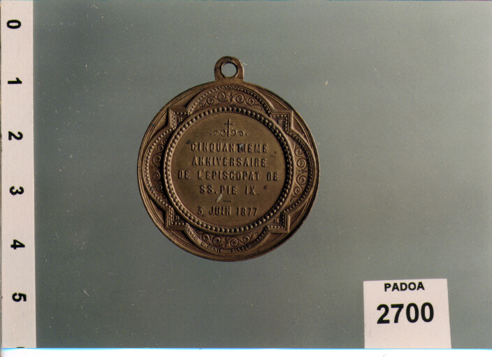 D/ PIVS IX PONTIFEX MAXIMVS, BUSTO A D. ; NEL TAGLIO, PENIN A. LYON; R/ CINQUANTIEME/ ANNIVERSAIRE/ DE L'EPISCOPAT DE/ SS. PIE IX/ 3 JUIN 1877, ENTRO ORNATO; SOTTO, L. PENIN A LYON