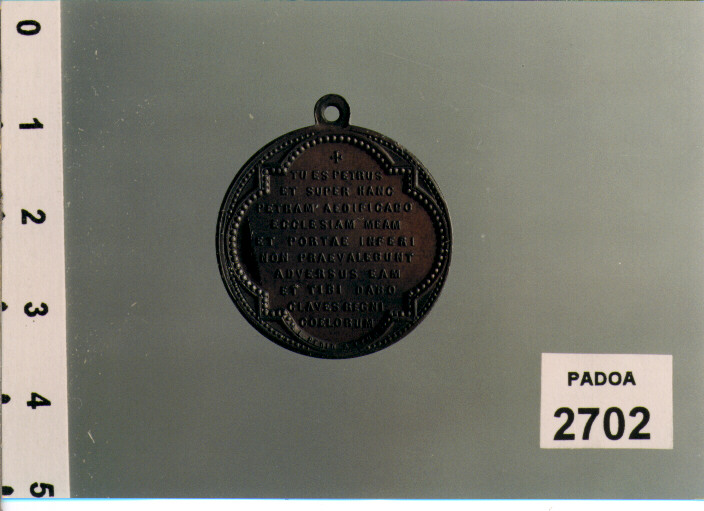 D/ PIUS NONUS PONTIFEX MAXIMUS, BUSTO A D.; SOTTO, L. PENIN A. LYON; R/ TU ES PETRUS/ ET SUPER HANC/ PETRAM AEDIFICABO/ ECCLESIAM MEAM/ ET PORTAE INFERI/ NON PRAEVALEBUNT/ ADVERSUS EAM/ ET TIBI DABO/ CLAVES REGNI/ CAELORUM, ENTRO ORNATO
