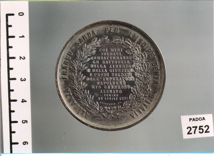 D/ VICTORIVS. EMMANVEL II D. G. REX. SARD. CYP. ET. HIER, TESTA LAUREATA A D.; SOTTO, GAYRARD F.; R/ ALLEANZA FRANCO-SARDA PER L'INDIPENDENZA D'ITALIA; NEL CAMPO, COI MIEI/ SOLDATI/ COMBATTERANNO/ LE BATTAGLIE/ DELLA LIBERTA'/ E DELLA GIUSTIZIA/..