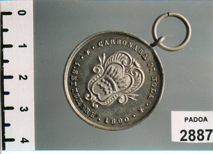 D/ SOCIETA' OPERAIA DI MUTUO SOCCORSO BENEDETTO CAIROLI, FASCIO DI SPIGHEAVVOLTE DA UN NASTRO CON SOPRA, VIS/ VNITA/ FORTIOR; R/ CARBONARA DI NOLA. 1. SETTEMBRE. 1890, STEMMA
