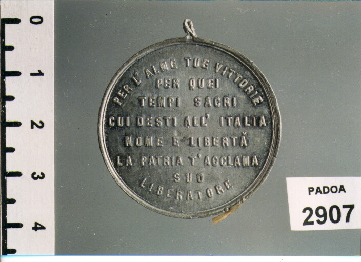 D/ RISPLENDERANNO LE TUE GLORIE ETERNE COME IL SOLE/ NELLE REGIONI SUPERNE, BUSTO DI PROSPETTO ENTRO RAMI DI OLIVO; R/ PER L'ALME TUE VITTORIE/ PERQUEI/ TEMPI SACRI/ CUI DESTI ALL'ITALIA/ NOME E LIBERTA'/ LA PATRIA T'ACCLAMA/ SUO LIBERATORE