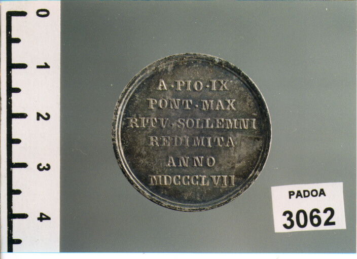 D/ MARIA. LVCANA. TVTELA. PRAESENS. BONON., LA MADONNA COL BAMBINO TRA LENUBI; R/ A. PIO. IX/ PONT. MAX/ RITV. SOLEMNI/ REDIMITA/ ANNO/ MDCCCLVII