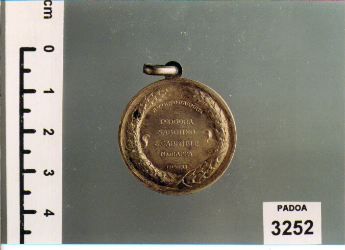 D/ . DEBELLARE SUPERBOS., COMBATTIMENTO DI AQUILE; SOTTO, M. GRAPPA; SUL BORDO, A. GIGLIOLI DIS.; R/ VI.O CORPO D'ARMATA/ RODGORA/ SABOTINO/ S. GABRIELE/ M. GRAPPA/ 1915-1918, ENTRO CORONA D'ALLORO; SOTTO, E. PAGANI MILANO