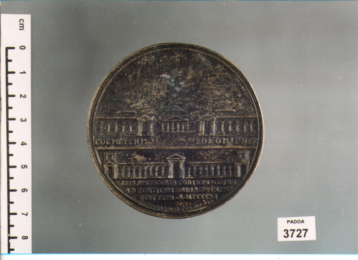 D/ NAPOLEO AVGVSTVS MARIA ALOISIA AVGVSTA, DUE TESTE ACCOLLATE A D.; R/ VEDUTA DEL CIMITERO BOLOGNESE; SOTTO, COEMETERIVM BONONIENSE; VEDUTA DEL PORTICO; SOTTO, LAPIS AVSPICALIS PORTICVS AC[.] EME[.]/ AD PORTICVM MARIA STVCANAS/ STATVTVS. A. MDCCCXI