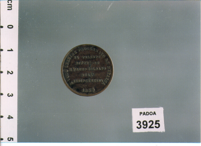 D/ VITTORIO EMANUELE II RE D'ITALIA, TESTA A D.; R/ A VOTO UNANIME PROCLAMATO RE D'ITALIA 1859; NEL CAMPO, IL VALENTE/ DIFENSORE/ E PRIMO SOLDATO/ DELL'/ INDIPENDENZA