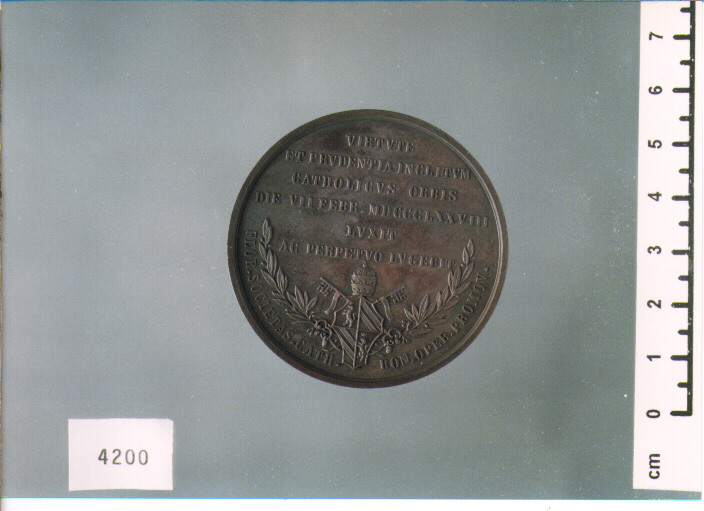 D/ PIVS. IX. PONT. MAX, BUSTO A S.; R/ VIRTVTE/ ET PRVDENTIA INCLITVM CATHOLICVS ORBIS/ DIE VII FEBR. MDCCCLXXVIII/ LVXIT/ AC PERPETVO LVGEBIT, STEMMA PONTIFICIO TRA RAMI D'ALLORO; SOTTO, FLOR. SOCIETAS. CATH. BON. OPER. PROMOV