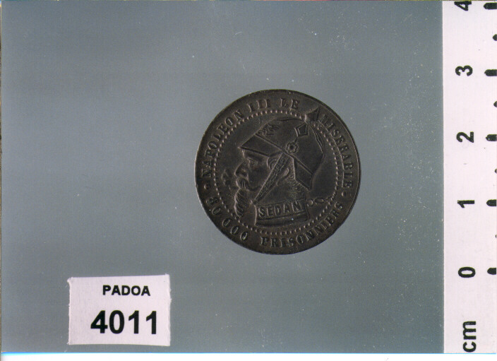 D/ NAPOLEON III LE MISERABLE. 80.000 PRISONNIERS, TESTA ELMATA A S.; R/ VAMPIRE FRANCAIS. 2 DEC.BRE 1851. 2 SEPT.BRE 1870, GUFO SU CANNONE ENTRO CERCHIO PERLINATO