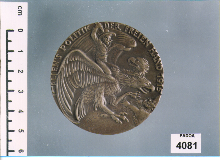 D/ ITALIEN'S POLITIK DER FREIEN HAND 1915, FIGURA A CAVALLO DI UN'AQUILA SU DUE TESTE; R/ DREIBVNDSCHMAROTZER-TREVBVND-VERROTZER, PERSONAGGIO PORTATO VIA DA DUE SOLDATI