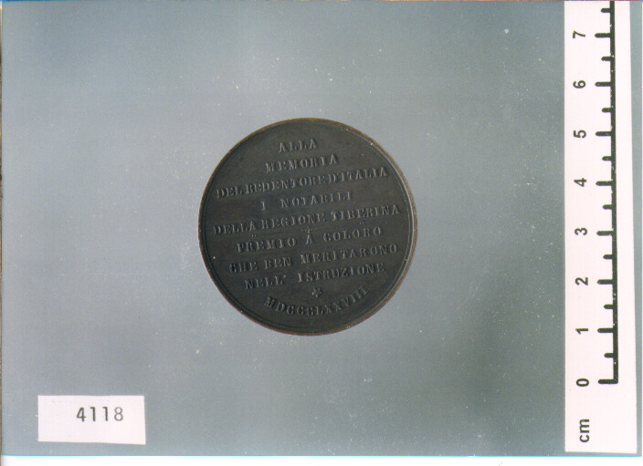 D/ VITTORIO EMANUELE II RE D'ITALIA, TESTA A S.; R/ ALLA/ MEMORIA/ DEL REDENTORE D'ITALIA/ I NOTABILI/ DELLA REGIONE TIBERINA/ PREMIO A COLORO/ CHEBEN MERITARONO/ NELL'ISTRUZIONE/ MDCCCLXXVIII