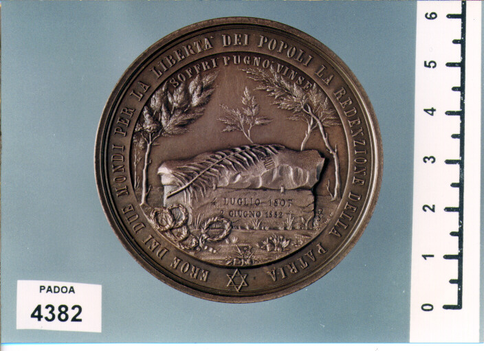 D/ GIUSEPPE GARIBALDI, BUSTO A S.; SOTTO, STABILIMENTO JOHNSON; R/ EROE DEI DUE MONDI PER LA LIBERTA' DEI POPOLI LA REDENZIONE DELLA PATRIA; VEDUTADELLA TOMBA DI GARIBALDI; SOPRA, SOFFRI' PUGNO' VINSE