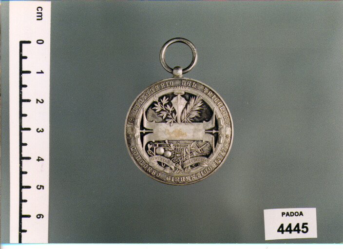 D/ SOCIETA' GINNASTICA LIGURE CRISTOFORO COLOMBO GENOVA, BUSTO A D.; SOTTO, P. FERREA; R/ 1.O CENTENARIO DEL TRICOLORE. CONCORSO GINNASTICO 1897, TABELLA VUOTA TRA VARI EMBLEMI