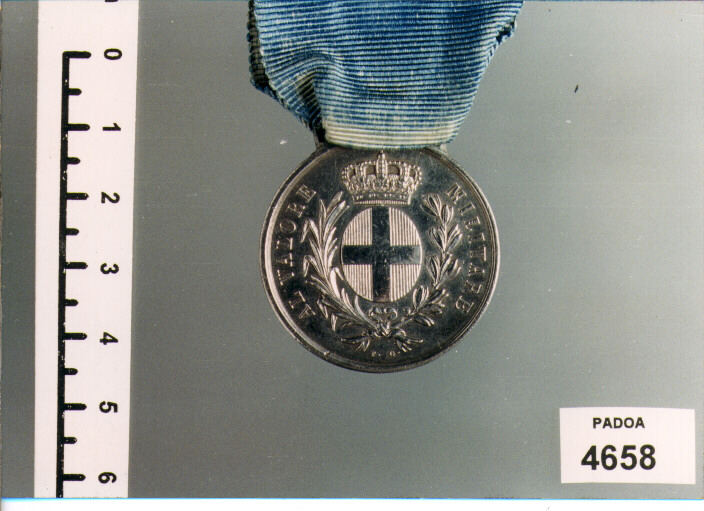 D/ AL VALORE MILITARE, SCUDO SABAUDO ENTRO CORONA DI PALMA E ALLORO; SOTTO, F. G.; R/ CAMPAGNA DELL'ITALIA MERIDIONALE 1860, CORONA DI ALLORO