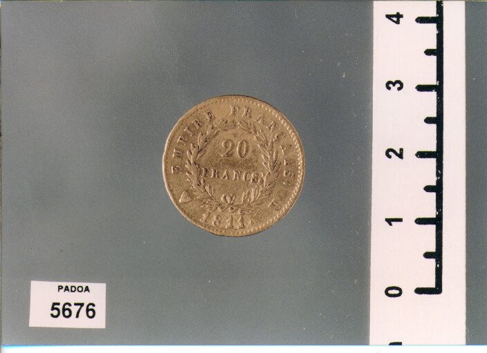 D/ NAPOLEON EMPEREUR., TESTA LAUREATA A S.; SOTTO T. R., NEL TAGLIO, DROZF.; R/ EMPIRE FRANCAIS. 1811; NEL CAMPO, 20/ FRANCS., ENTRO CORONA DI ALLORO; SOTTO 1811 TRA CUORE E LETTERA U. TAGLIO: DIEU PROTEGE LA FRANCE