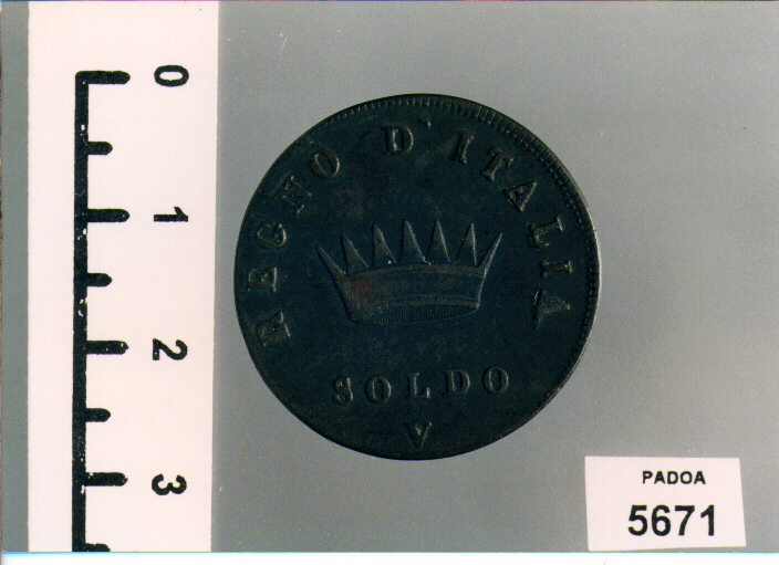 D/ NAPOLEONE IMPERATORE E RE, TESTA A S.; SOTTO 1808 TRA ANCORA E COPPA CAPOVOLTA; R/ REGNO D'ITALIA, CORONA; SOTTO, SOLDO/ V