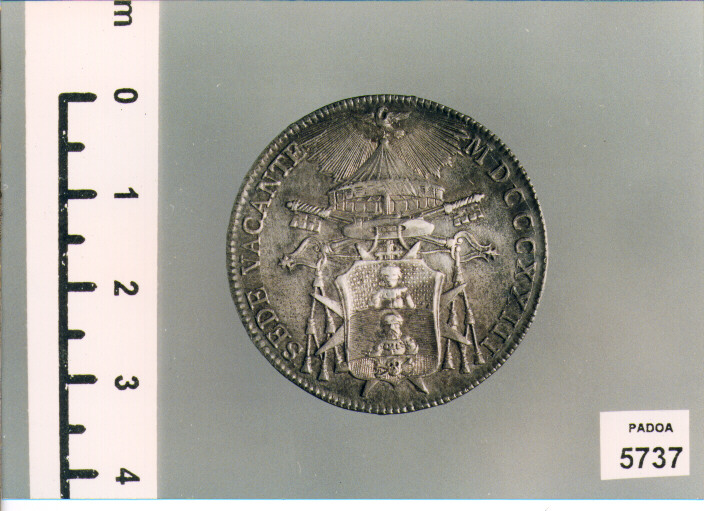D/ SEDE VACANTE MDCCCXXIII, STEMMA SOVRAPPOSTO A CROCE DI MALTA, SORMONTATO DA CHIAVI DECUSSATE E PADIGLIONE; R/ AVXILIVM DE SANCTO, LA CHIESA SEDUTA TRA LE NUBI REGGE CHIAVI NELLA MANO D. E TEMPIETTO NELLA S.; SOTTO B