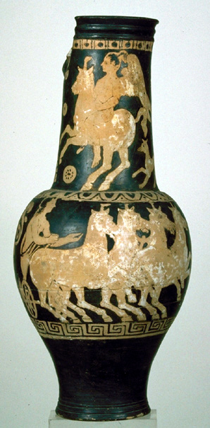 Alto becco, ansa a nastro con rotelle, collo cilindrico, corpo espanso, fondo piano esternamente modanato. Decorazione accessoria: sul collo: volute con fiori campanulati; sulla spalla: ovoli; al di sotto dell''ansa: palmetta impostata su volute che includono palmette, fiori e foglie. Rappresentazioni figurate: Collo: Eros su cavallo al galoppo verso sinistra. Corpo: quadriga in corsa verso destra guidata da figura giovanile nuda con manto poggiato su una spalla