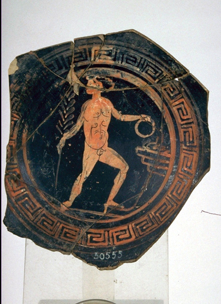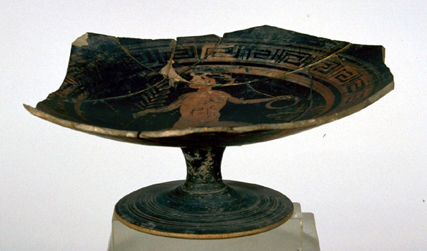 Bassa vasca, piede a disco con alto fusto. Decorazione accessoria: intorno al medaglione, meandri; al di sotto delle anse, palmetta fiancheggiata da volute. Rappresentazioni figurate: Interno: Figura maschile nuda restrospiciente in atto di salire il gradino del podio di un''ara con fuoco acceso, con corona nella sinistra protesa verso l''ara