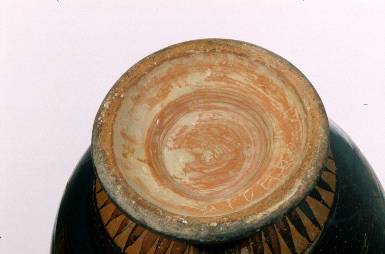 A: processione nuziale. B: thiasos dionisiaco. In A: su quadriga, sposa ammantata e sposo nell''atto di tenere le redini, verso destra, dietro al carro figura femminile ammantata, stante, presso i cavalli figura virile con cetra, verso sinistra, all''estremità destra figura femminile ammantata con torce e figura virile gradiente verso destra, con petasos e bastone. In B: al centro Dioniso con kantharos e tralcio di vite, verso destra, tra menade e coppia di menade e satiro danzanti, rivolti verso il centro. Sull''orlo catena di bottoni di loto chiusi rivolti in fuori; sul lato esterno dell''orlo in A meandro continuo, in B edera; alla base del collo baccellature nere, foglie d''edera nere delimitano ai lati la metopa; alla base raggiera