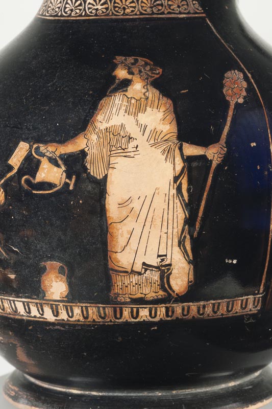 Satiro porge sedia a Dioniso Entro metopa: piccolo satiro, verso destra nell''atto di porgere una sedia a Dioniso, con corona d''edera sul capo, kantharos e tirso. In basso al centro oinochoe. Metopa delimitata in alto da serie di palmette erette a sette foglie circoscritte da girale su doppia voluta, ed in basso da ovoli