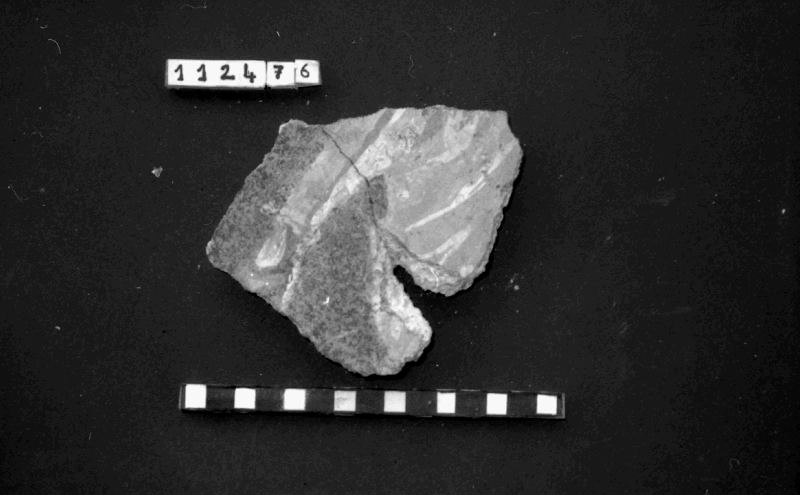 la decorazione, su fondo nero, è costituita da una figura (maschile?), della quale rimangono parte del busto e del braccio sinistro con mano priva delle dita. Al polso due armille. L'abbigliamento (una tunica manicata?) è reso con pennellate in verde ed azzurro