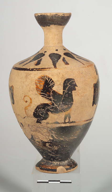lekythos attica a figure nere con sfinge tra due figure in armi