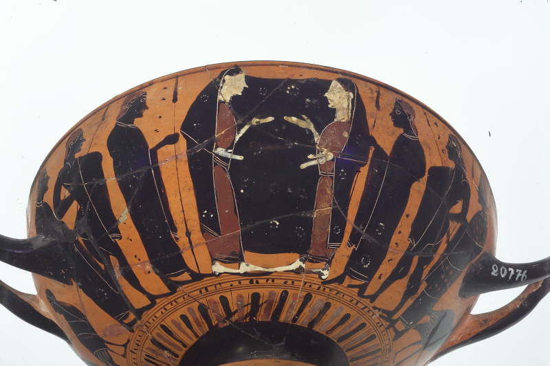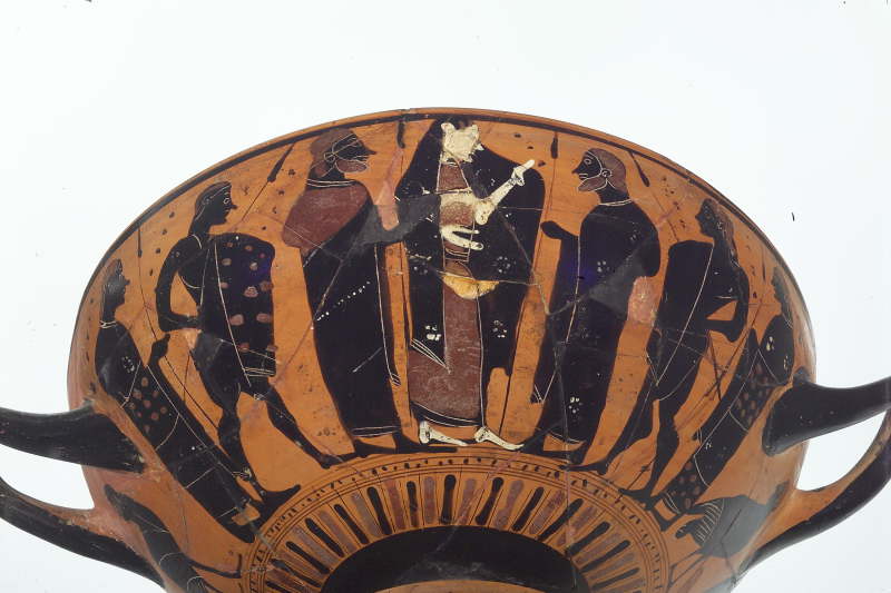 kylix a figure nere con personaggi ammantati che partecipano ad un rito