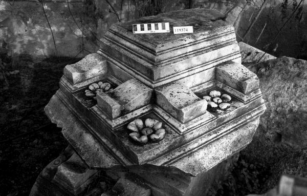 grande cornice a modanature lisce con mensole e cassettoni. La sima è costituita da un listello e da un'alta gola dritta separata con un sottile dentello da una piccola gola rovescia. Una bassa fascia costituisce la fronte del soffitto sorretto da mensole lisce di forma parallelepipeda, leggermente concave nella parte anteriore e chiuse anteriormente da una tavoletta. Sui lati liberi le mensole sono incorniciate da una tenia e da una gola rovescia che delimita anche il lato posteriore dei cassettoni. Questi sono aperti nella parte anteriore e sono decorati con rosette di varia foggia. La sottocornice, al di sotto della fascia di imposta delle mensole, presenta un sottile tondino ed un'alta fascia liscia separati da una tenia; seguono un ovolo e una gola rovescia distinti tra loro e dalle modanature soprastanti da sottili dentelli continui. Grappa antica di restauro all'estremità sinistra del piano di appoggio inferiore