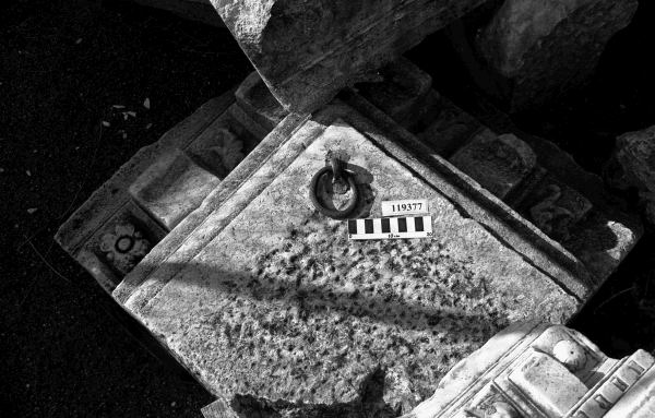 grande cornice a modanature lisce con mensole e cassettoni. La sima è costituita da un listello e da una gola dritta, separata con un sottile dentello da una bassa gola rovescia. La corona è ridotta ad un sottile listello. Il soffitto è sorretto da larghe mensole parallelepipede prive di rivestimento e leggermente concave nella parte anteriore, incorniciate da una tenia e da una gola rovescia che delimitano anche il lato posteriore dei cassettoni. Questi sono aperti nella parte anteriore e sono decorati con calici vegetali e rosette di varia foggia. Al di sotto della fascia di imposta delle mensole sono un grosso dentello continuo, una tenia, un ovolo liscio e un sottile dentello. Anathyrosis nei fianchi. Nel piano di appoggio inferiore è infisso un anello metallico di impianto moderno