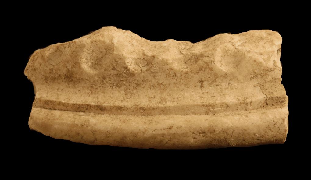 scultura e plastica, elementi di arredo, vaso . Frammento marginale superiore pertinente ad un vaso (cratere?). Resta una porzione del corpo, decorato da sei strigilature, di cui si conservano solo le estremità terminali, raccordato all’orlo piatto ed estroflesso da scozia e gola diritta. Interno liscio. Superficie interessata da leggere incrostazioni e scheggiature