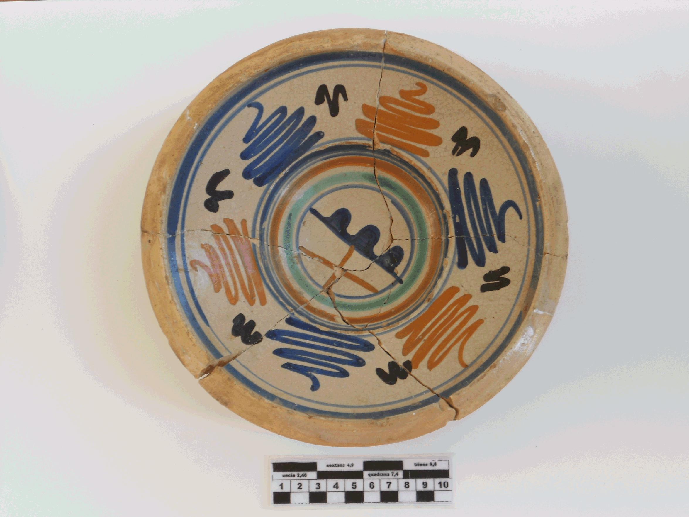 vasellame in ceramica, maiolica rinascimentale, piatto . Piatto in maiolica rinascimentale caratterizzato da orlo a dente, tesa inclinata, cavetto emisferico, piede ad anello. Sulla tesa dopo un fascia e una riga in blu vi sono monticelli in blu e senape alternati a onde in bruno; nel cavetto fasce blu, verde e senape e motivo araldico (famiglie Aldemorisco o Stagno) in giallo e blu. Prodotto locale