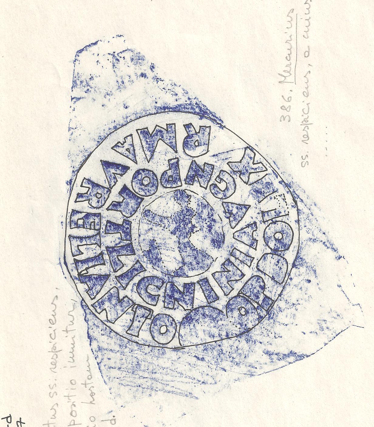 elementi architettonici e di rivestimento, materiali da costruzione, tegola . frammento di tegola con impressione di bollo a forma orbicolare, (diam 10, lit. 1,2-1,4). OP DOL EX PR M AVRELI ANTO / NINI AVG N PORT LIC . (CIL XV 408a, Steinby 385)