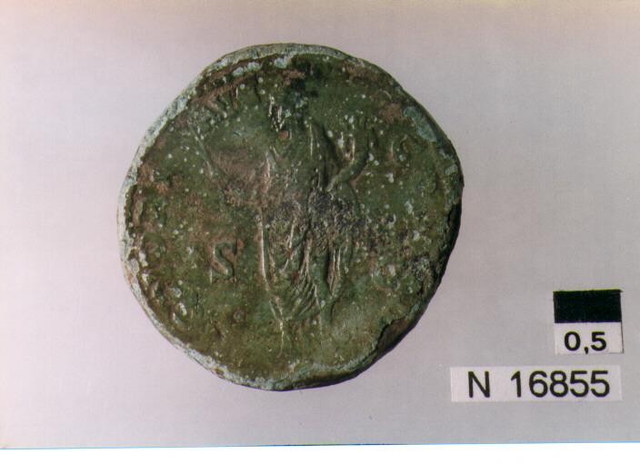 R: testa di Antonino Pio radiata a destra/ V: Felicitas (?) stante con latesta rivolta a sinistra, tiene un ramo d'olivo nella destra e la cornucopia nella sinistra SC ai lati in basso,