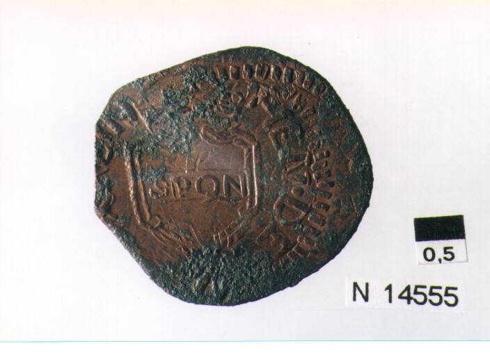 R/ scudo coronato contenente in una fascia iscrizione; V/ tre spighe legate da un ramoscello d'olivo,