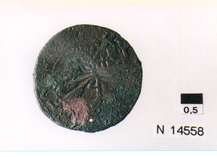 R/ scudo coronato contenente in una fascia iscrizione; V/ tre spighe legate da un ramoscello d'olivo,