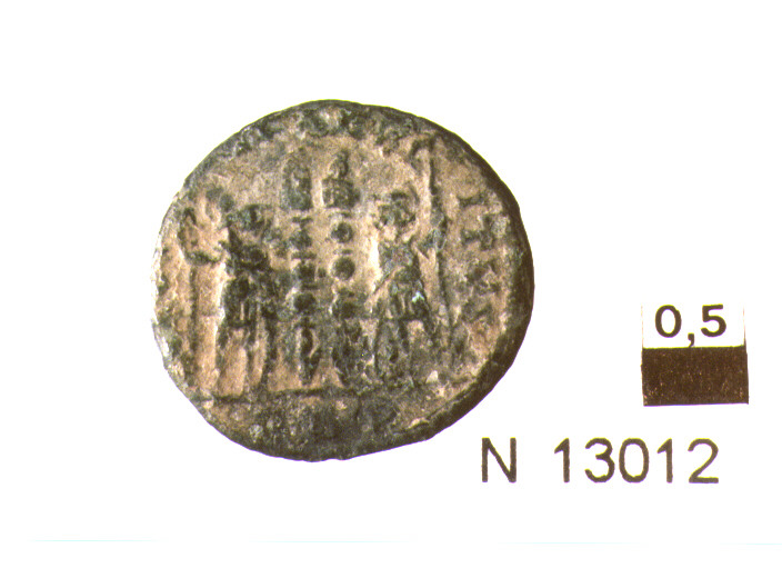 R/ busto drappeggiato, corazzato e diademato di imperatore a destra; V/ due soldati stanti l'uno verso l'altro, con lancia e scudo, tra due stendardi,