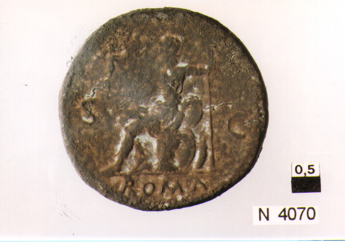 R/ testa laureata di Nerone a destra; V/ Roma elmata in abiti militari, seduta su corazza a sinistra tiene piccola vittoria e lancia,