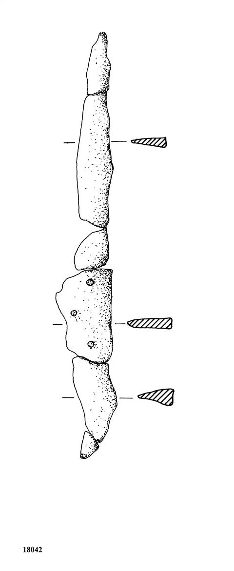 Lama triangolare a sezione triangolare, lungo innesto a codolo a sezione triangolare, manico a lingua di presa con tre chiodi di bronzo