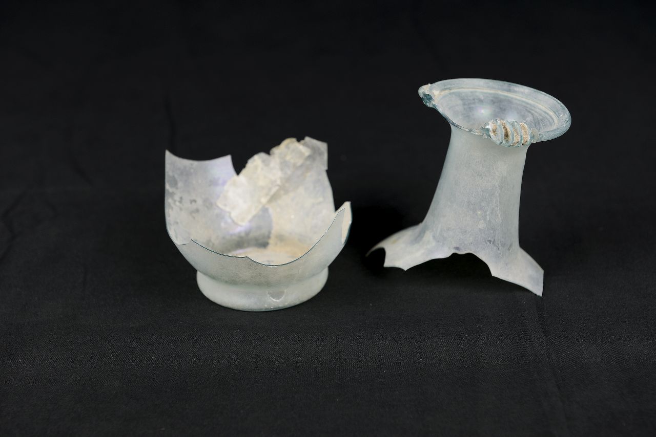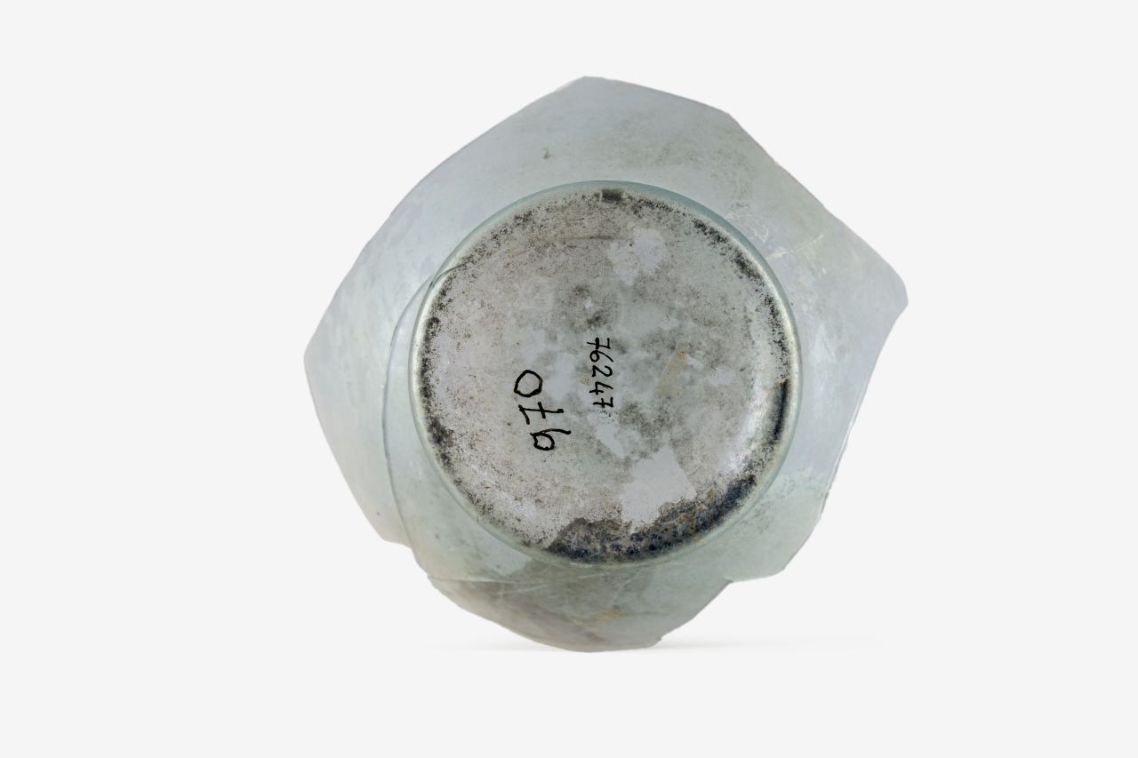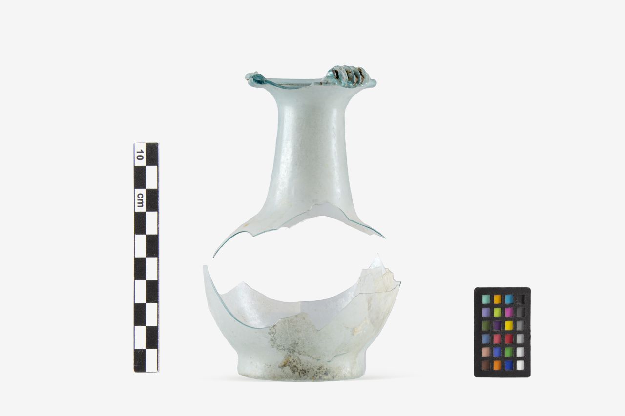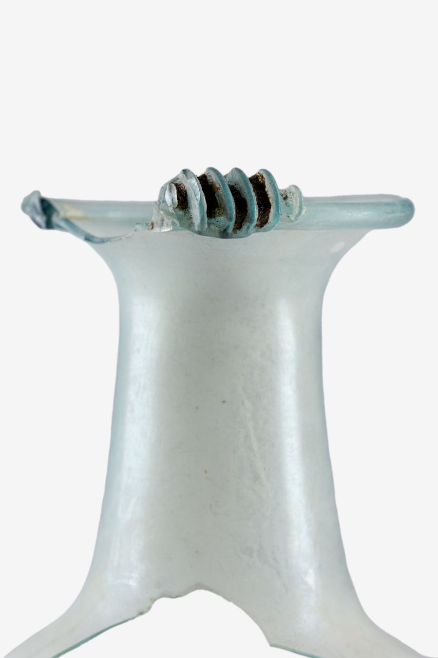 - NOTIZIE STORICO CRITICHE Questa brocca è imparentata con modelli attestati nella bronzistica e nelle forme di vasellame in argento di I secolo d.C. (Tassinari 1993, p. 31-33, Strong 1966, p. 141, fig. 28a). L' esemplare trova confronti diretti con reperti di provenienza pompeiana (Scatozza Höricht 2012, tav. II, n. 1668 e 6837). In area campana e non solo (Massabò 2007, p. 102), la brocca è attestata sia in vetro trasparente con sfumature azzurre/verdi sia in vetro blu. Altri esemplari, aventi le stesse caratteristiche morfologiche ma di formato più grande, sono stati rinvenuti nel territorio di Stabia (Scatozza Höricht 1986, p. 50). La produzione di questa forma sembra non oltrepassare il I secolo d.C., termine oltre il quale non è finora attestata