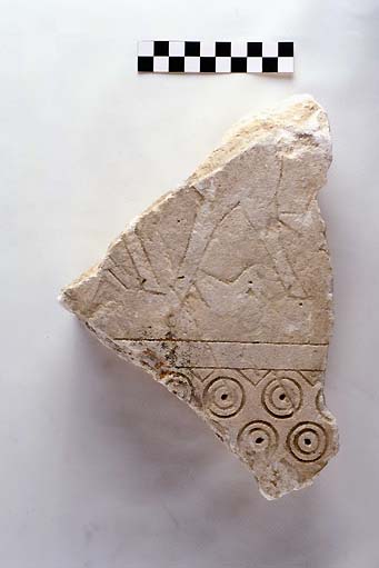 frammento di forma triangolare pertinente a parte centrale di stele con ornamenti; è in parte conservata la decorazione dei lati A e B