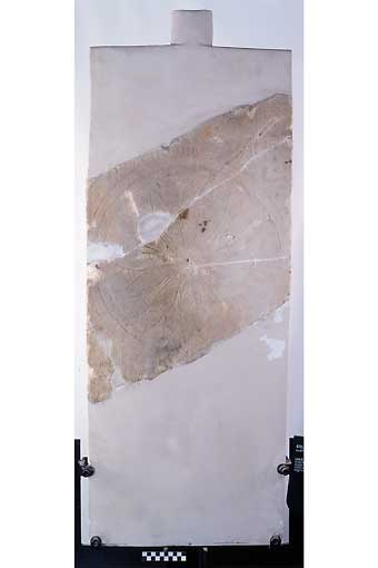 lastra di forma romboidale in tre frammenti, pertinente a stele con armi, spezzata in alto ed in basso, la cui forma originaria, rettangolare con collo cilindrico, e' stata reintegrata con il restauro e l'aggiunta di integrazioni moderne