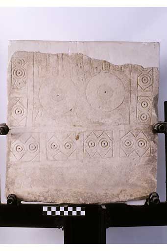 lastra di forma rettangolare, pertinente a parte inferiore di stele con ornamenti, con integrazioni dovute al restauro moderno