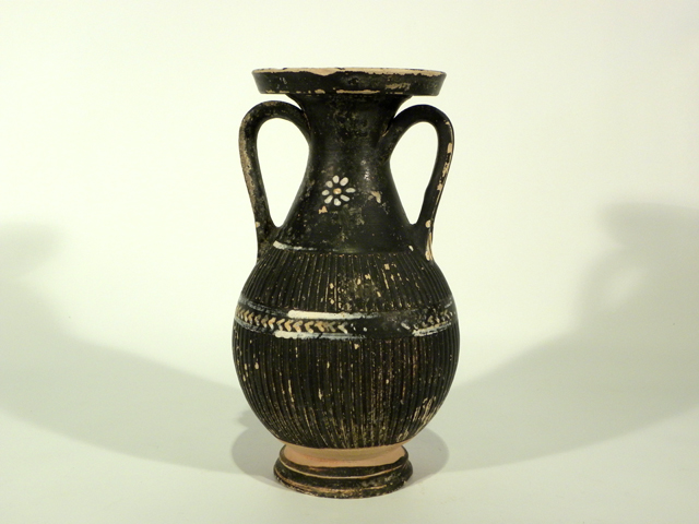 Pelike con corpo ovoide baccellato, orlo a disco, anse a nastro scannalate, piede ad anello con risega