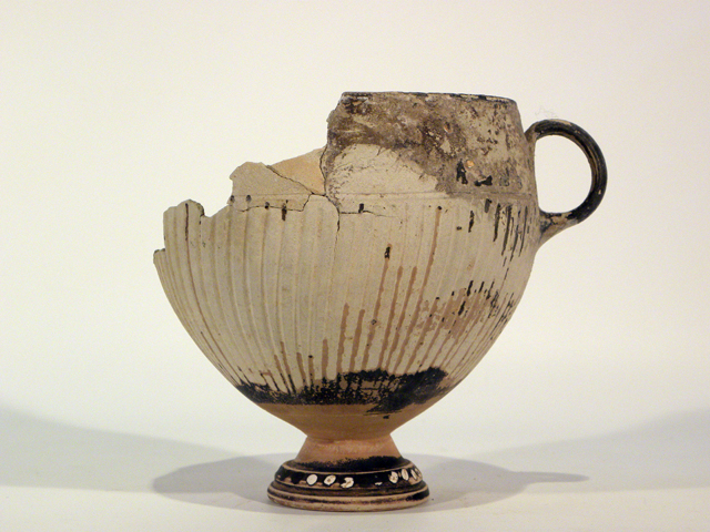 Skyphos con corpo baccellato, anse ad anello impostate verticalmente, piede ad echino