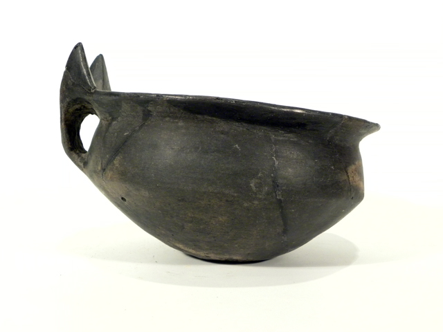 Scodella con vasca carenata su fondo piano, orlo estroflesso, anse a nastro con apici a cornetti