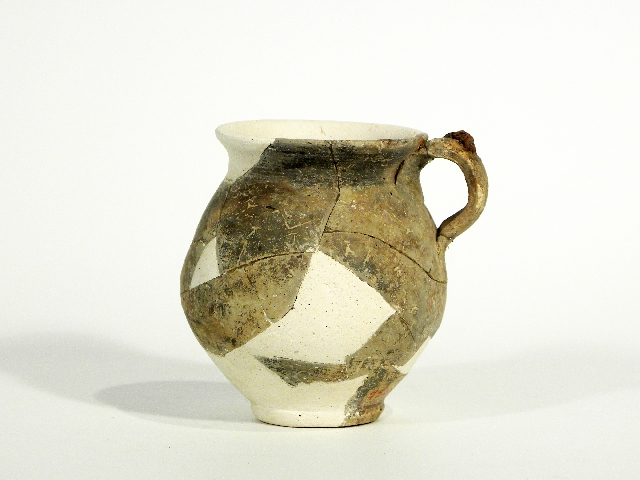 Boccale a corpo globoso su piede troncoconico, orlo svasato, ansa a nastro