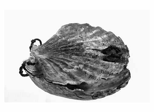 portagioie conformato a conchiglia bivalve del tipo "pecten jacobaebus"; come cerniera tra le due valve sono applicati due anelli d'argento; sull'orlo della valva superiore e' applicata una maniglia emisferica con estremi ripiegati ed inseriti in anelletti; tinta con porpora la valva superiore