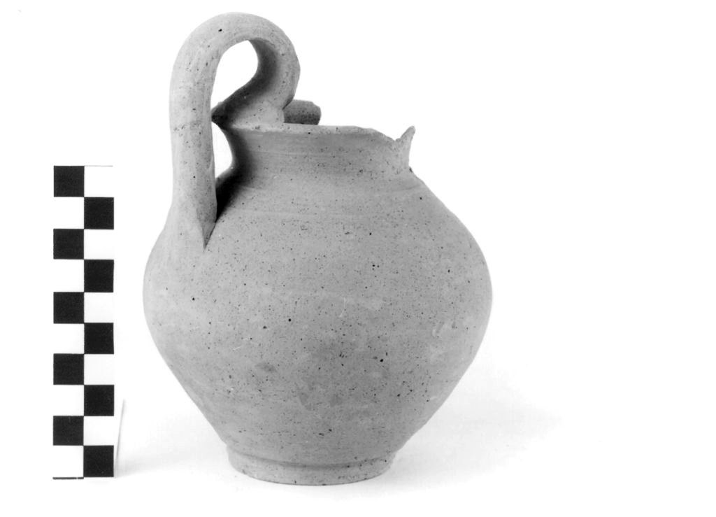 piede a disco; corpo globulare; labbro estroflesso, distinto alla base; ansa a nastro, verticale sormontante