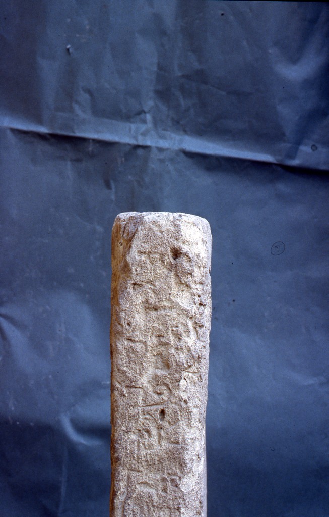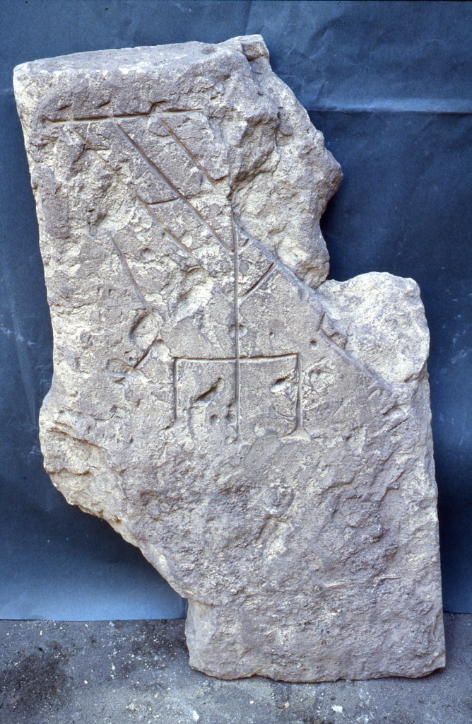 Stele in calcare tenero frammentaria alla base e sul lato destro, mutila della parte sommitale. Sul lato lungo destro si scorgono segni di un'iscrizione oggi illegibile. Il verso ospita l'incisione di una menorà a sette bracci compresa tra due shofarot