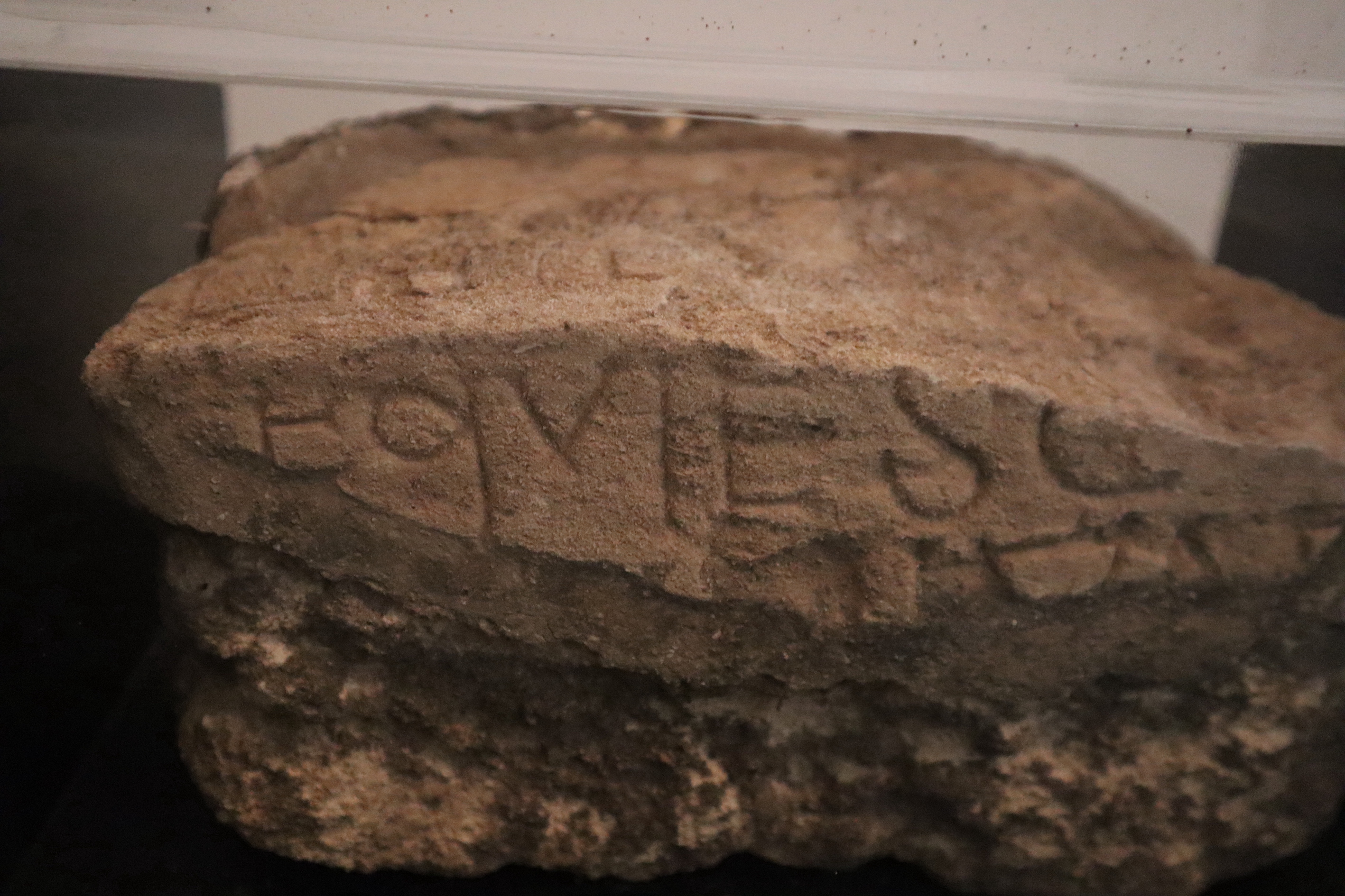 Stele in calcare tenero con iscrizione bilingue, ebraica sul recto e latina sulla sommità. Entrambe le incisioni a tutt'oggi sono poco leggibili