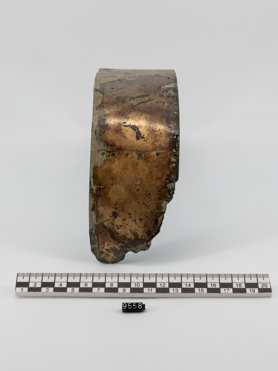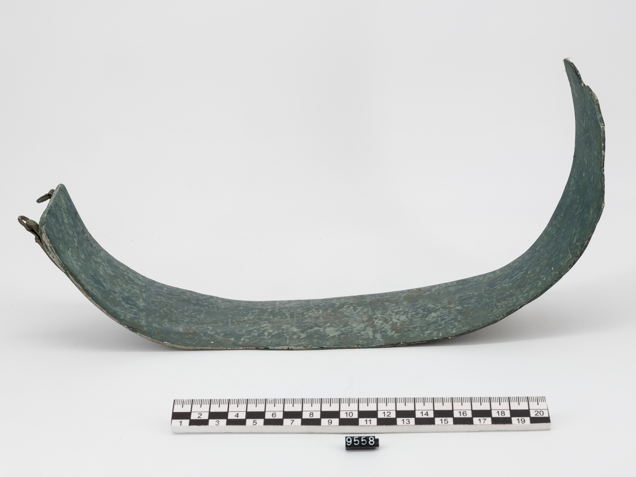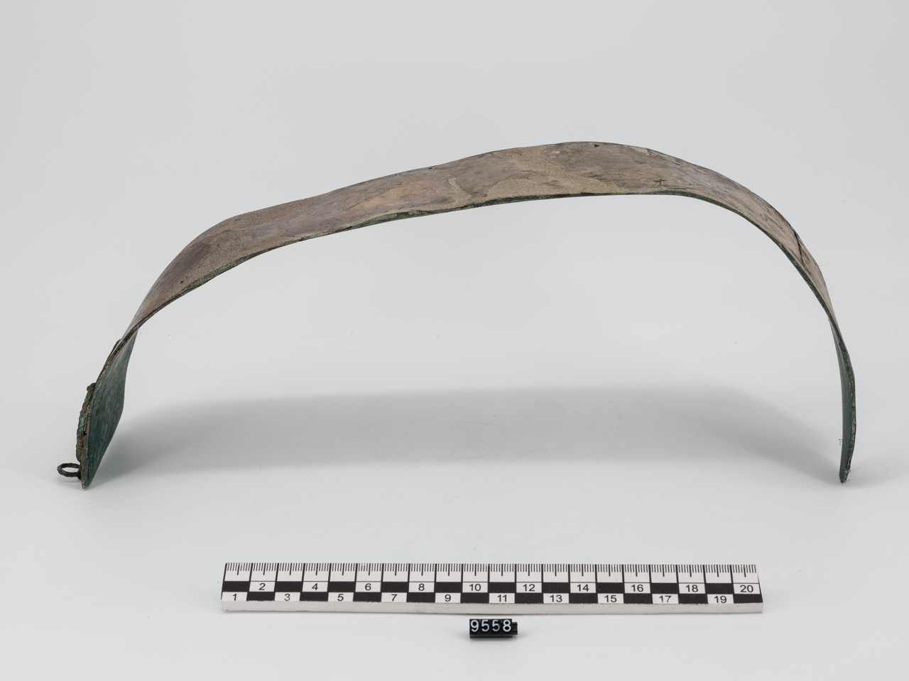 Frammento di fascia di cinturone; parte posteriore con fasce laterali fissate con piccoli chiodi, bordi forati per il passaggio dei chiodi; due ganci sagomati a forma di palmetta allungata, con anelli per l'aggancio all'altra estremità, saldati alla fascia da chiodini